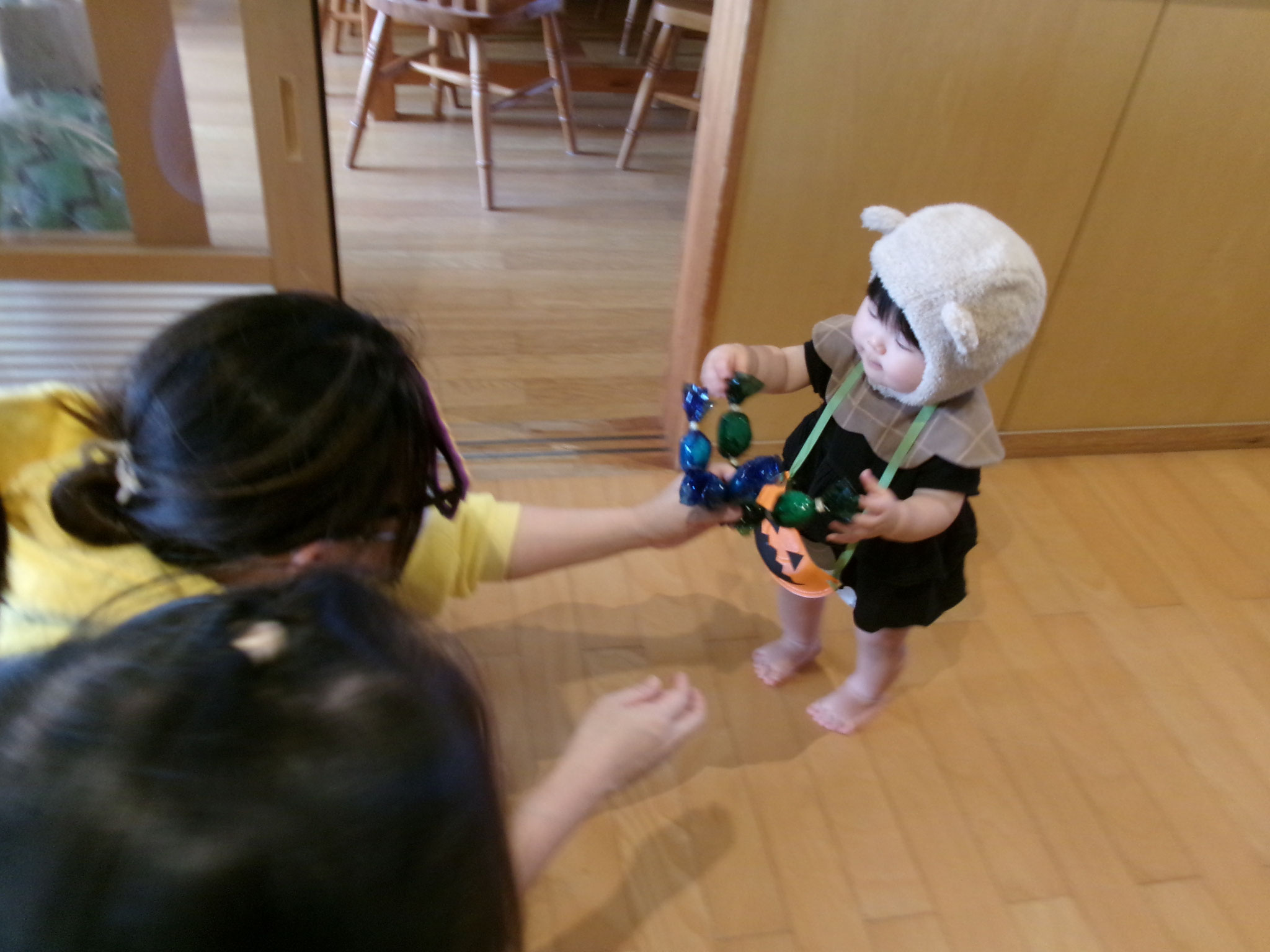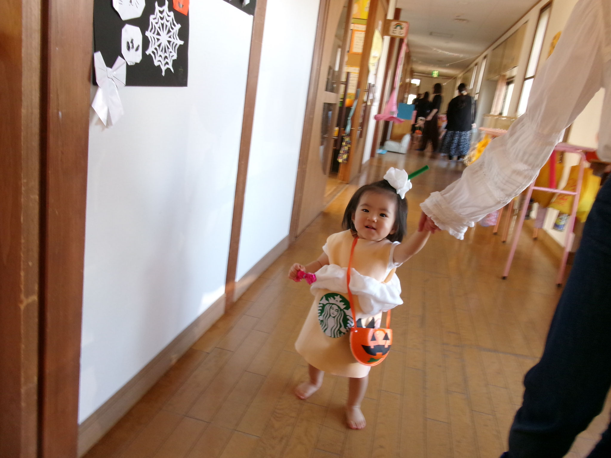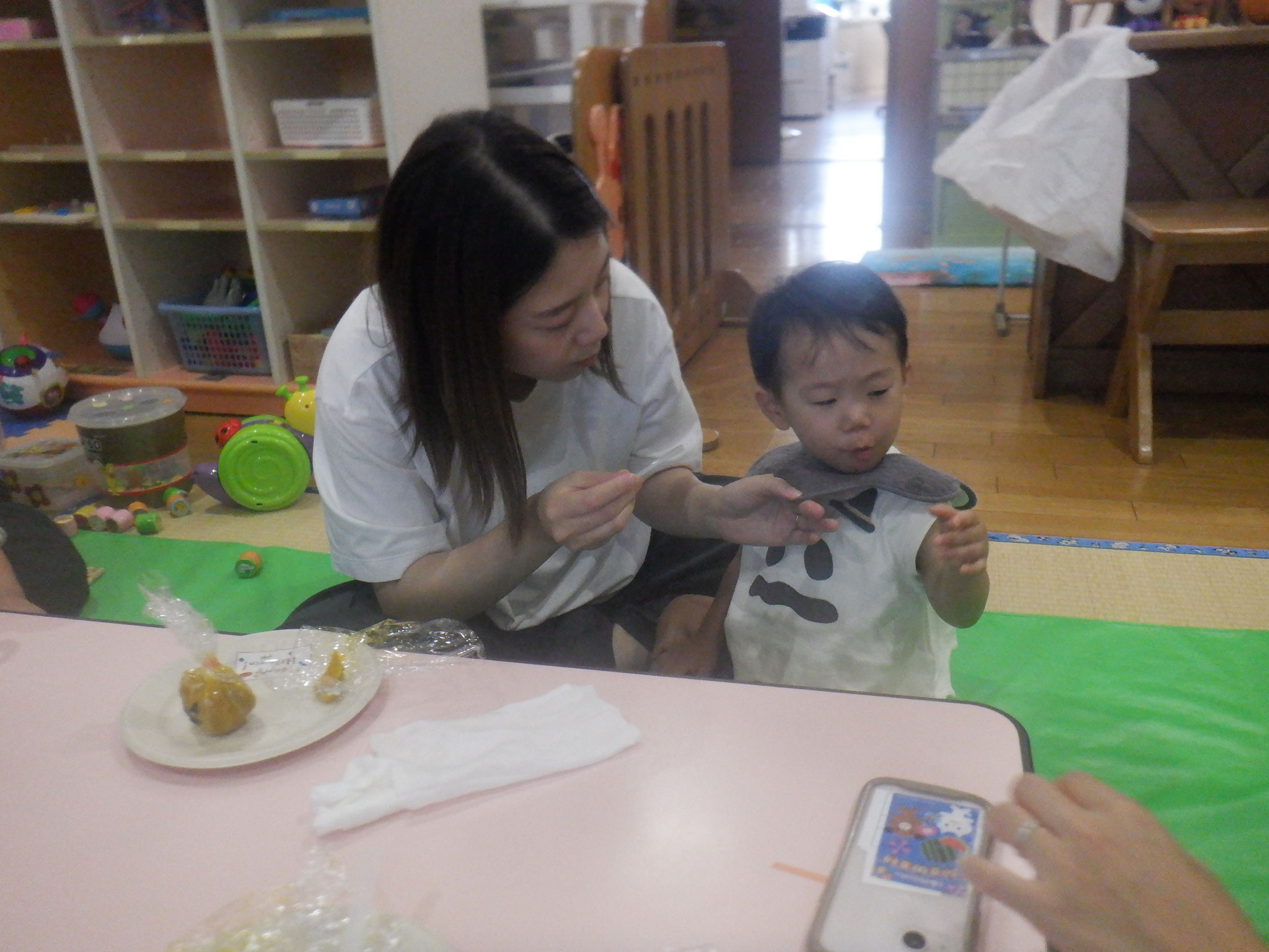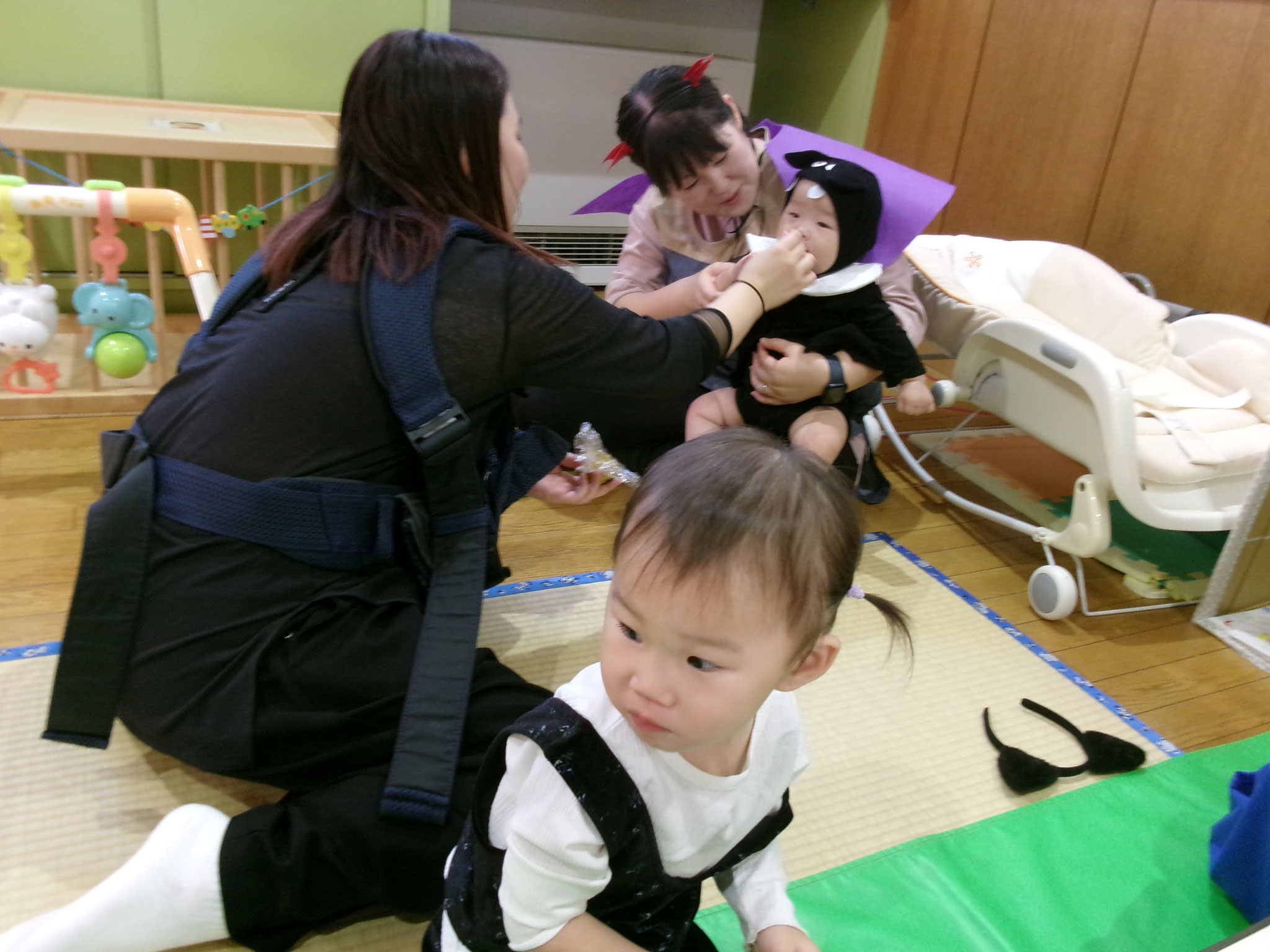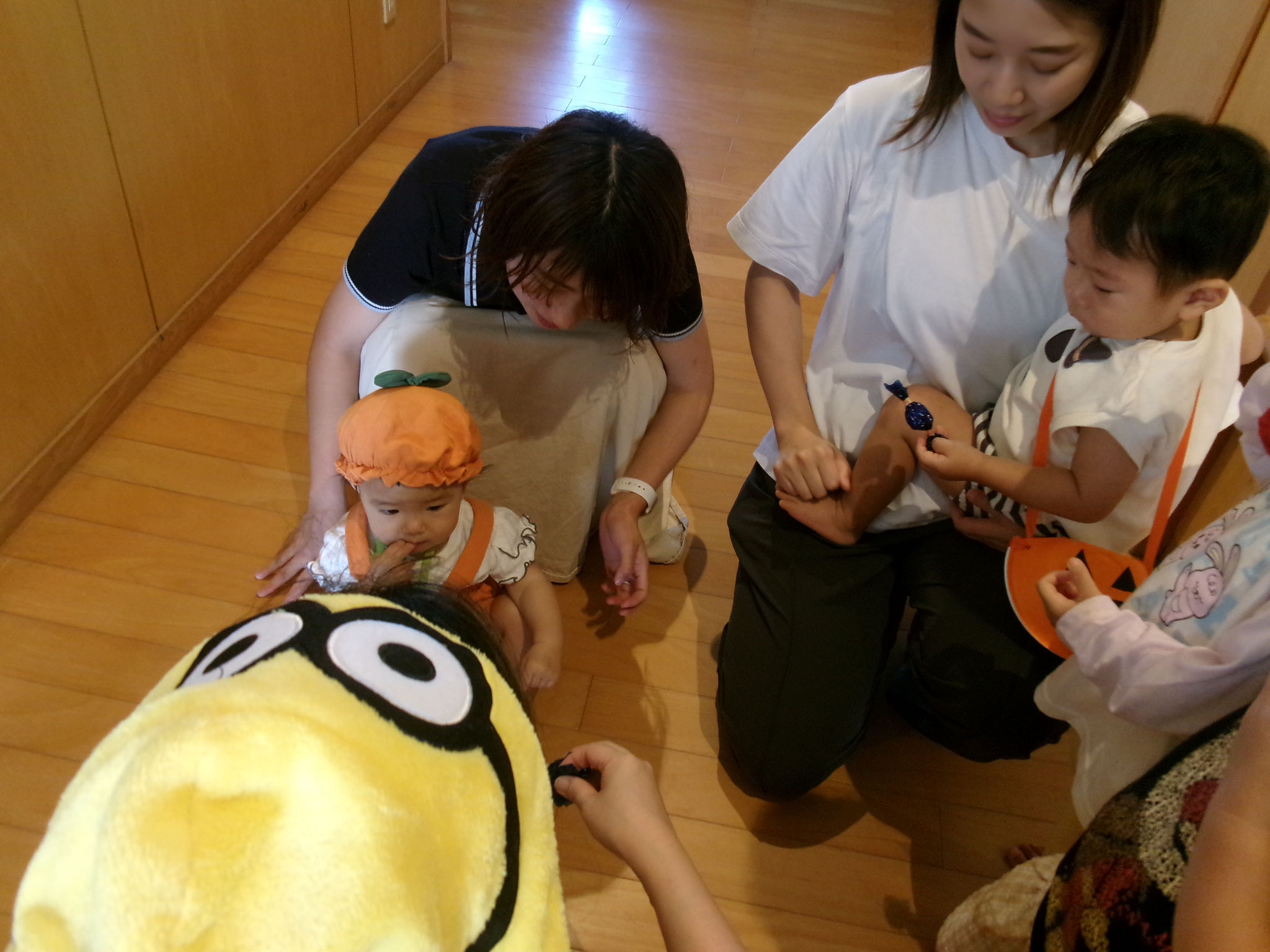かわいく仮装してきてくれたり、ママの手作り衣装だったりと、ママ達(おばあちゃんも含め)の器用さに😲びっくり!そんな姿にぽっぽらんどお手製のハロウィンバックをつけて、じんぼほいくえん内にいる仮装した人を見つけてお菓子をもらってこよう!のゲームをしたり、地域の方からいただいたかぼちゃをペーストし、みんなでハロウィン仕様のかぼちゃ茶巾を作って、おいしく食べました😋