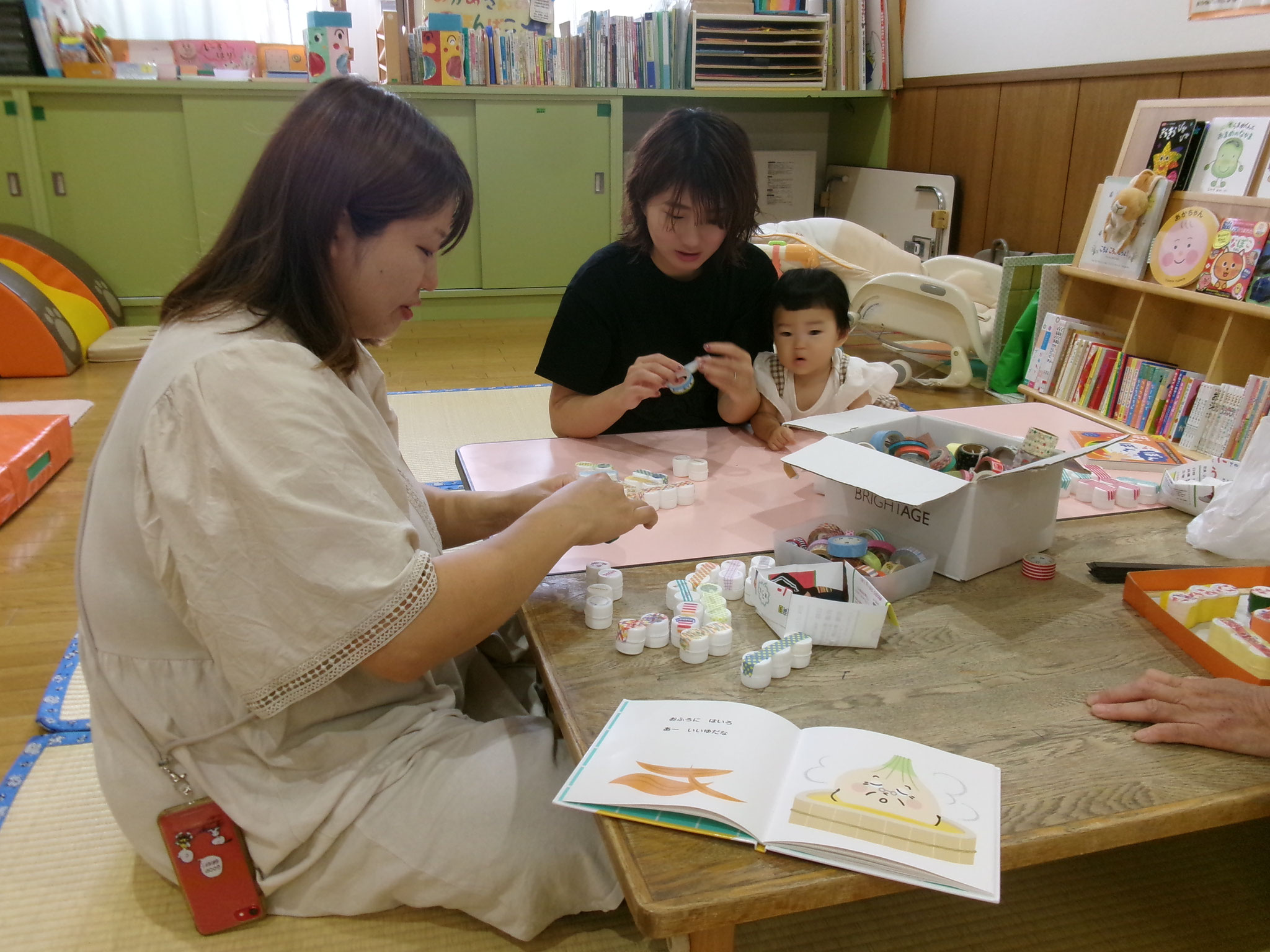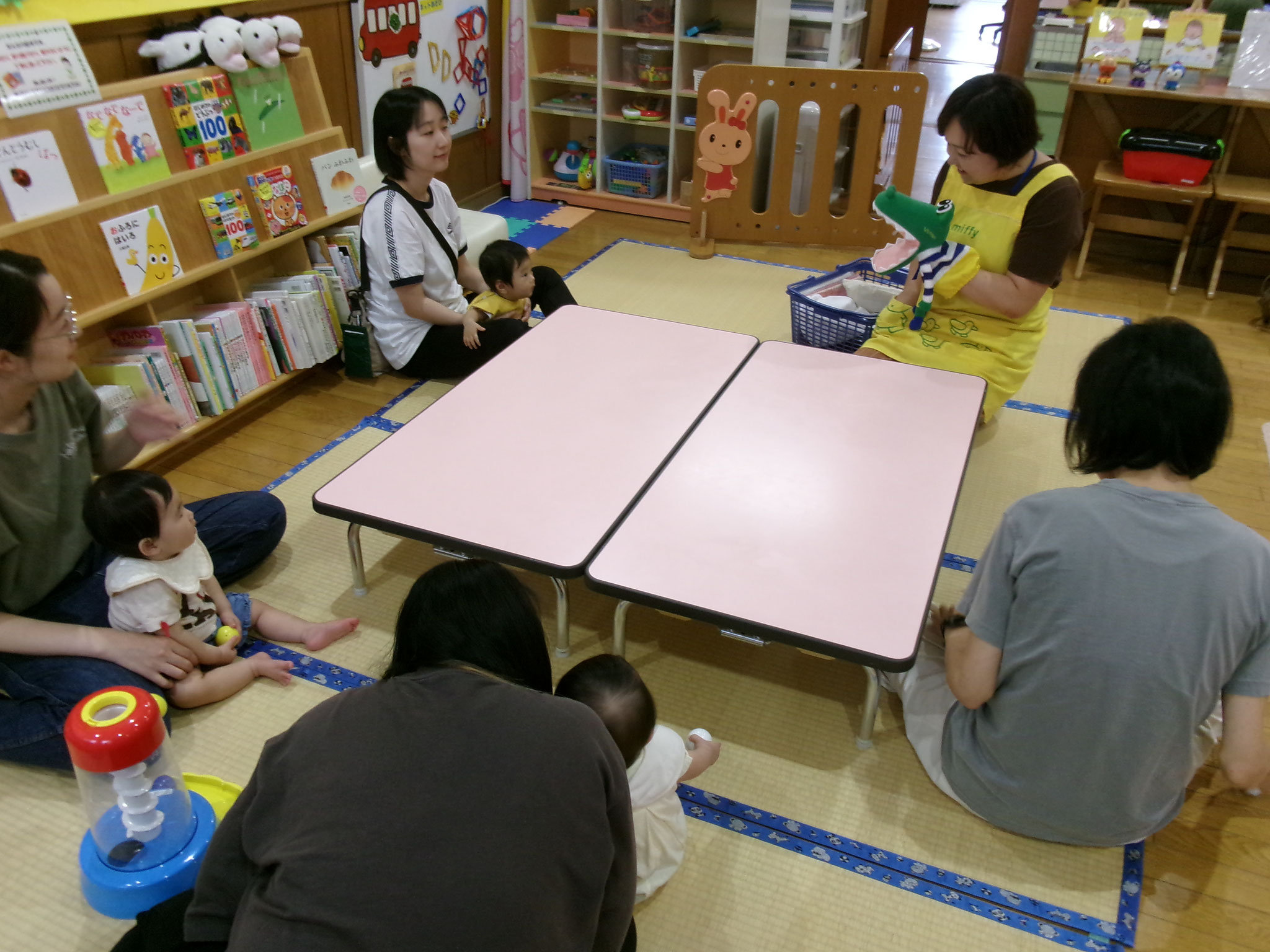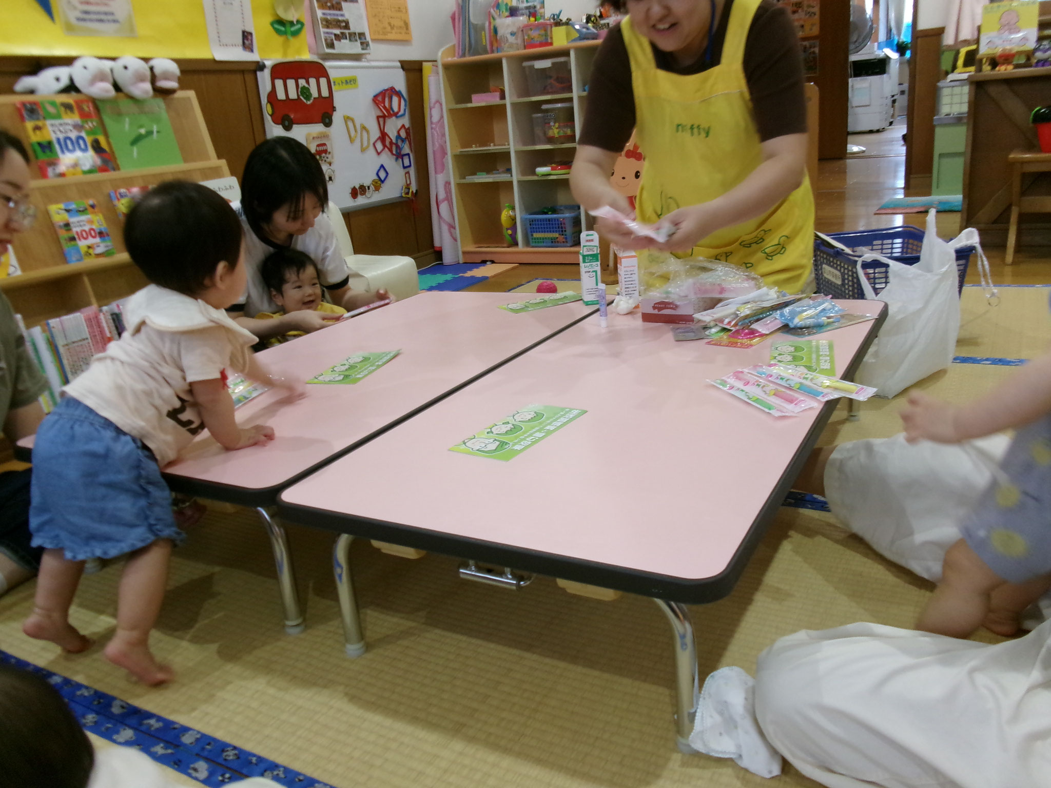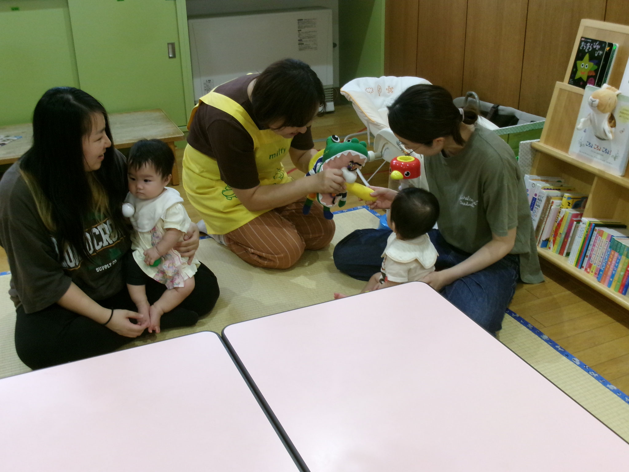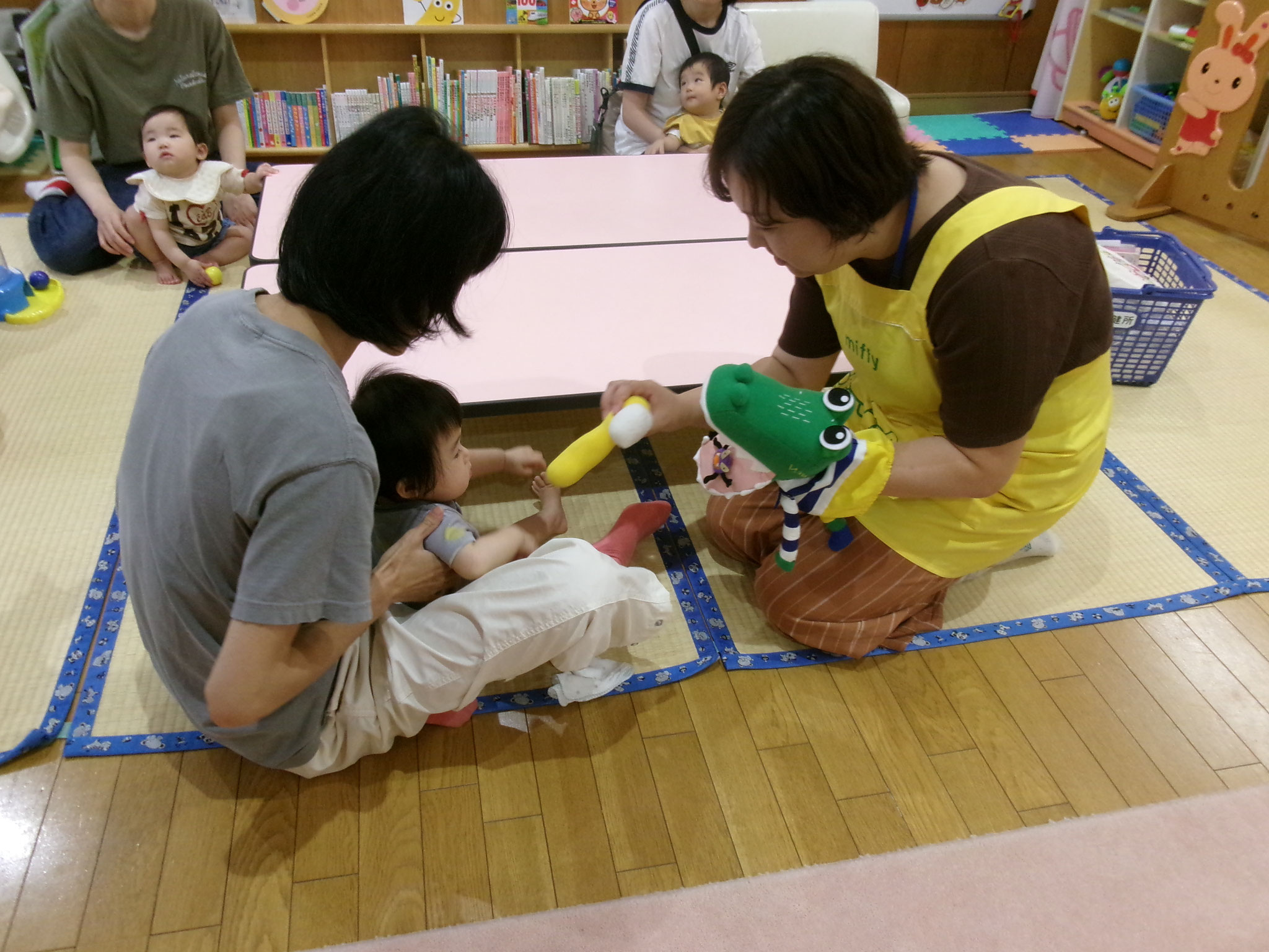 ワニ🐊のパペットが登場すると、ちょっと引き気味の子ども達でしたが、ママと歯磨きゴシゴシして、