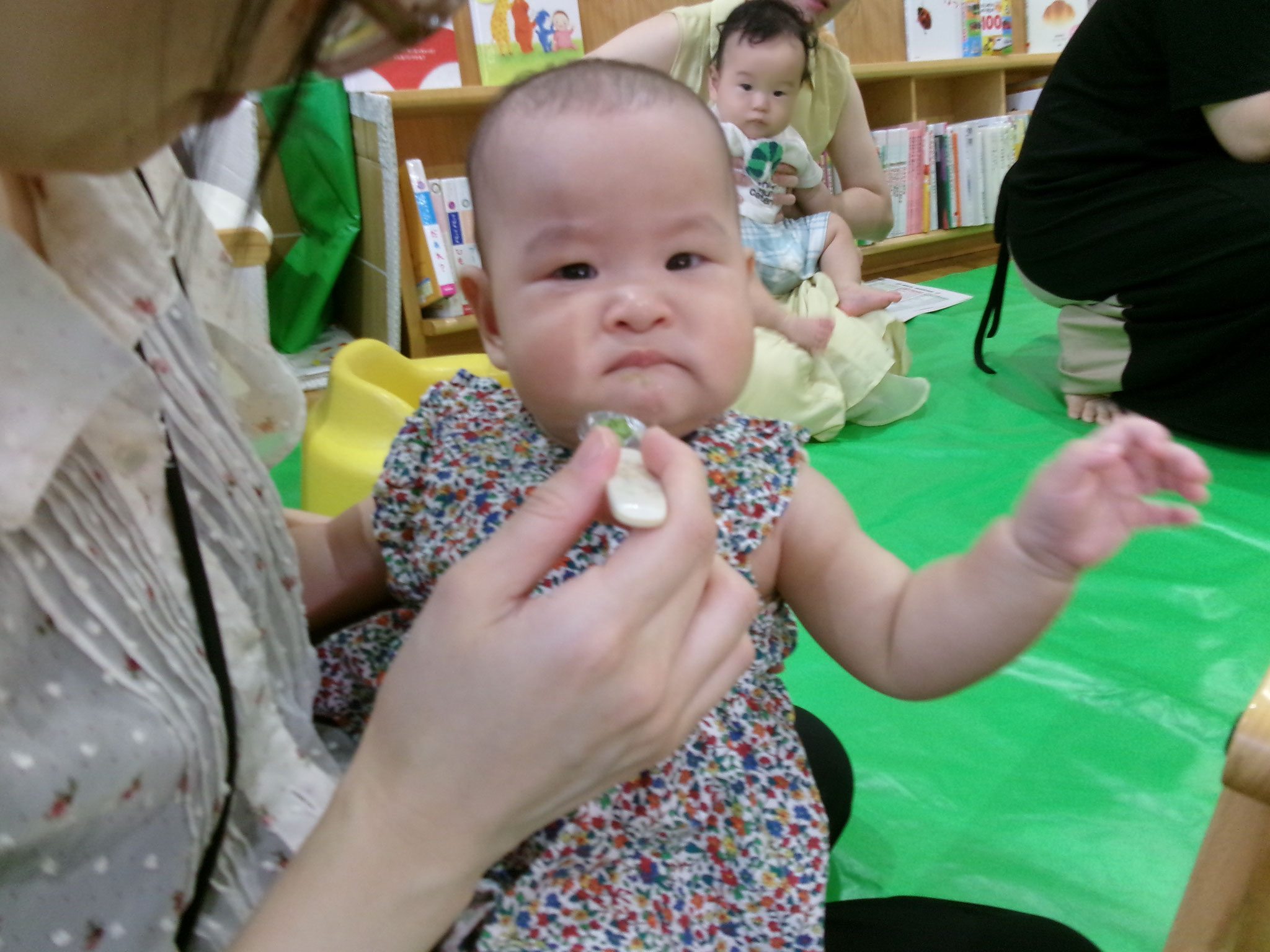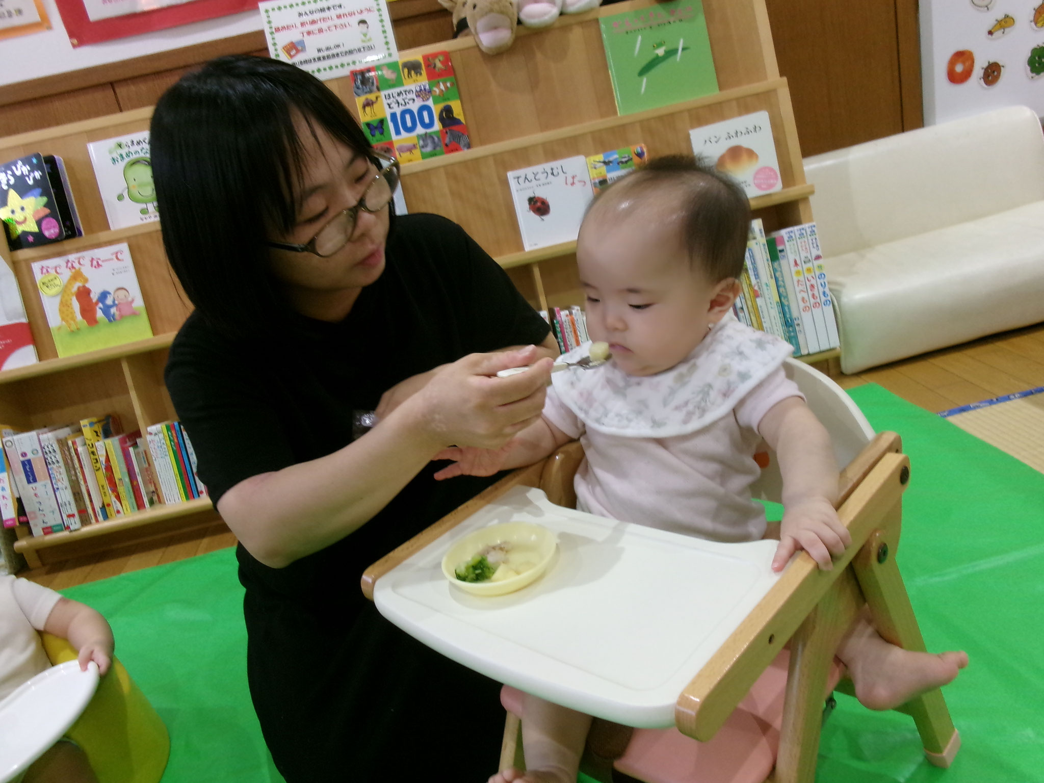 富山西福祉センターから栄養士の鈴木先生を招いて、食に関すること、ママ達の悩み相談、そして、実際に保育園で提供している離乳食の給食試食会という、お得な♡講座です。はじめての育児での“食”に関する悩みが大変多い中、鈴木先生がママ達の悩みに丁寧に答えてくださり、時間がたりなーーい!ほどでした!