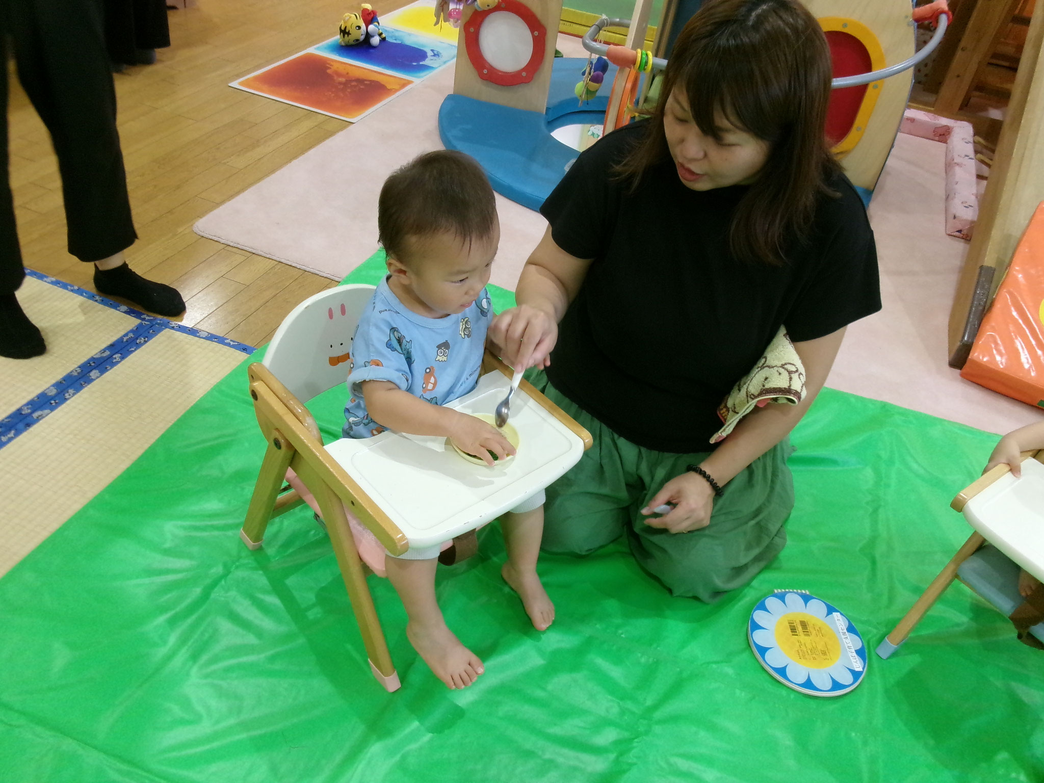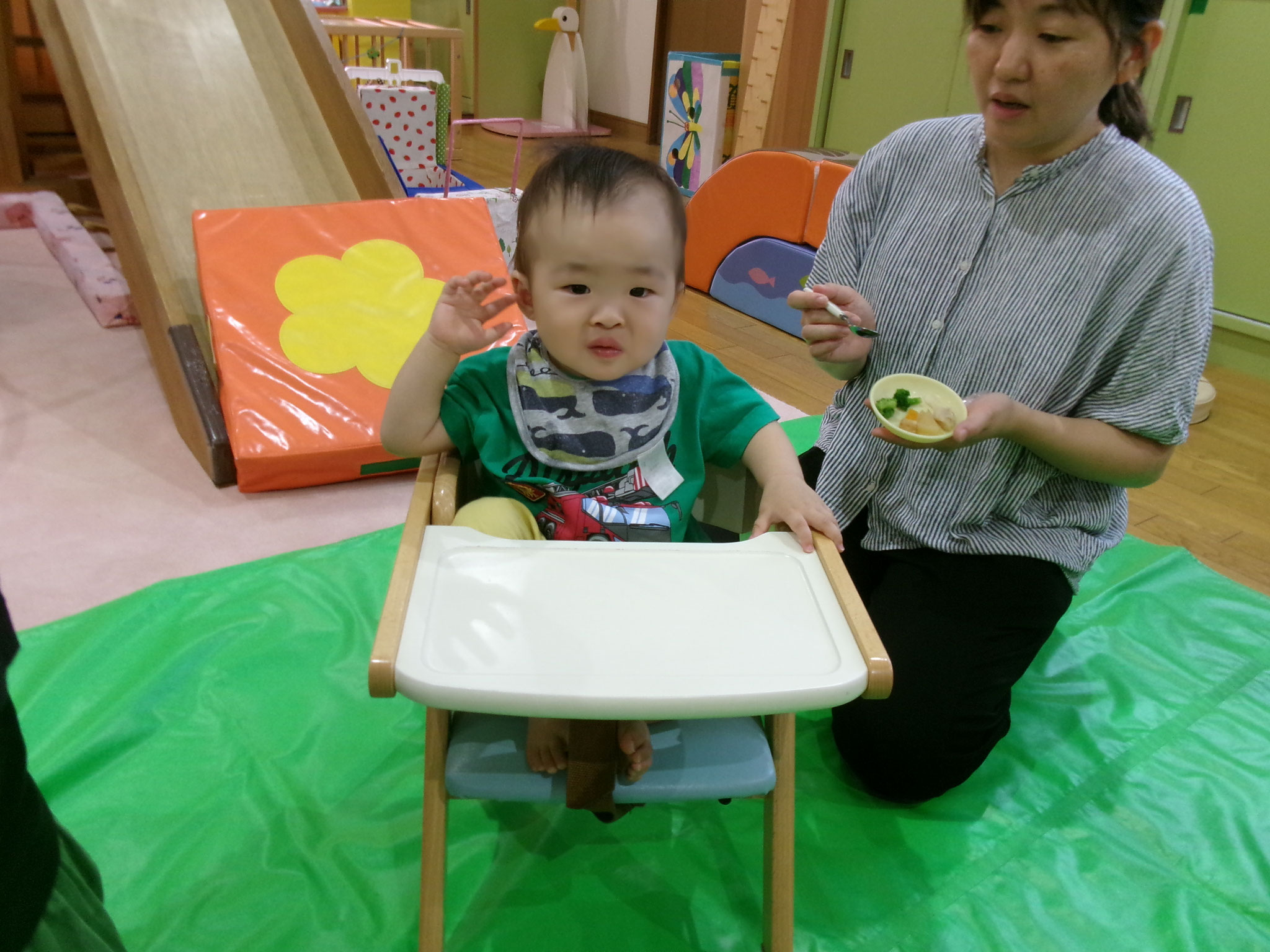 給食の離乳食も、段階別に並べ、お子さん、そして、ママ達にも試食してもらうと、このくらいの味付けになるんだな~このくらいの大きさであげてもいいんだな~ということが見て、味わっていただけたのではないでしょうか。おこさんたちも、はじめての給食、満足していただけたかな😋