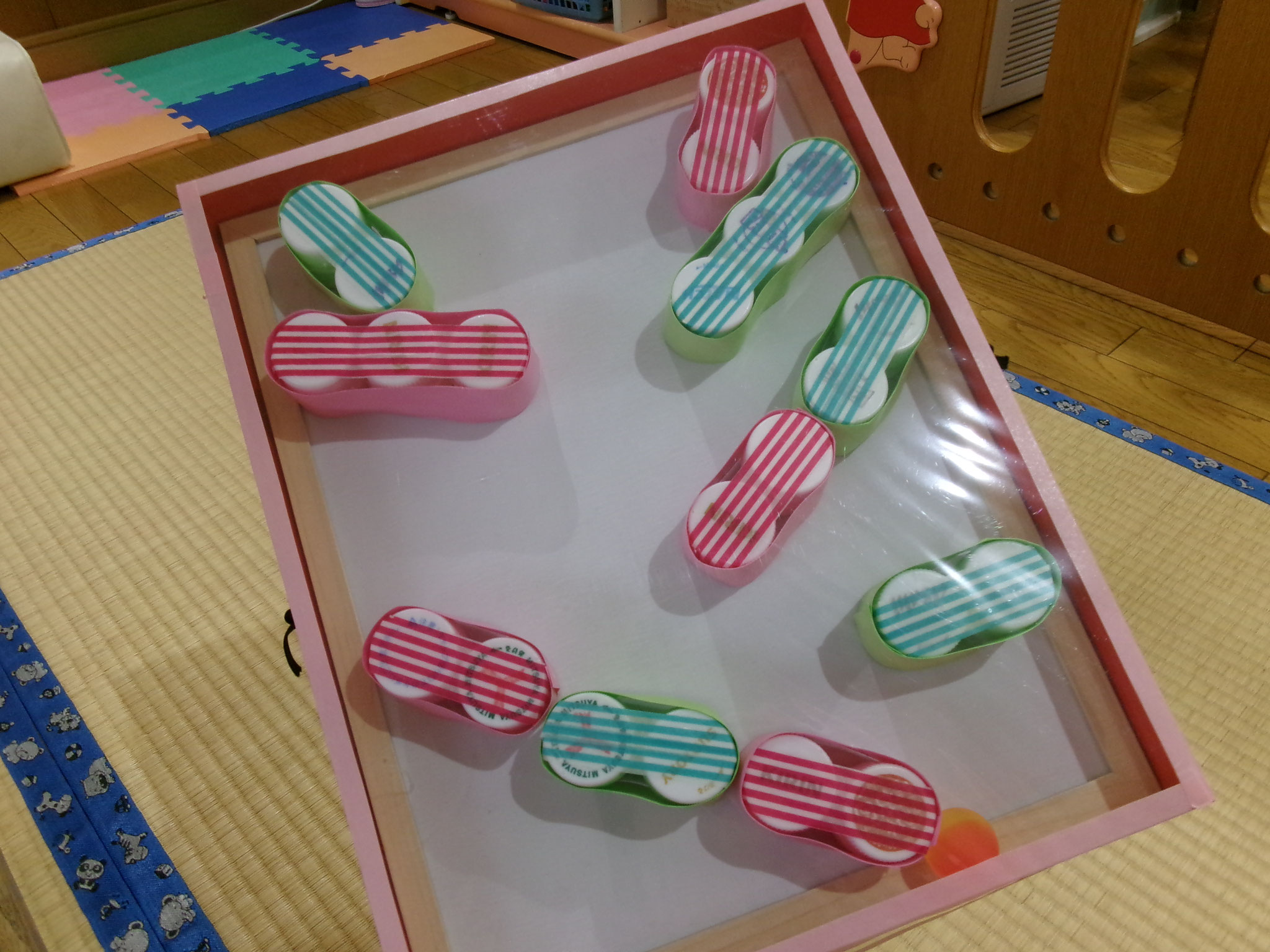 ペットボトルの蓋を再利用して、ボールがコロコロ転がっていく柱に変身。この柱は裏に磁石がついているので、いつでも自由自在可動式です。